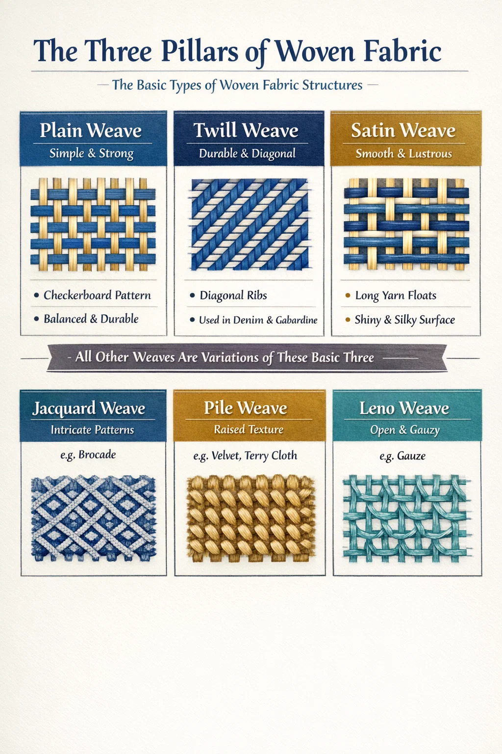 Míg a textíliáknak több száz konkrét piacneve létezik, technikailag vannak három alapvető szövettípus szerkezetek, amelyekből szinte az összes többi származik: Sima szövésű, Twill szövésű és Szatén szövésű . Minden más változat, mint például a Jacquard, Dobby vagy Halom szövés, ennek a három alapvető átlapolási mintának a komplex módosítása. E kategóriák megértése alapvető fontosságú bármely textiltermék tartósságának, borításának és használhatóságának meghatározásához.