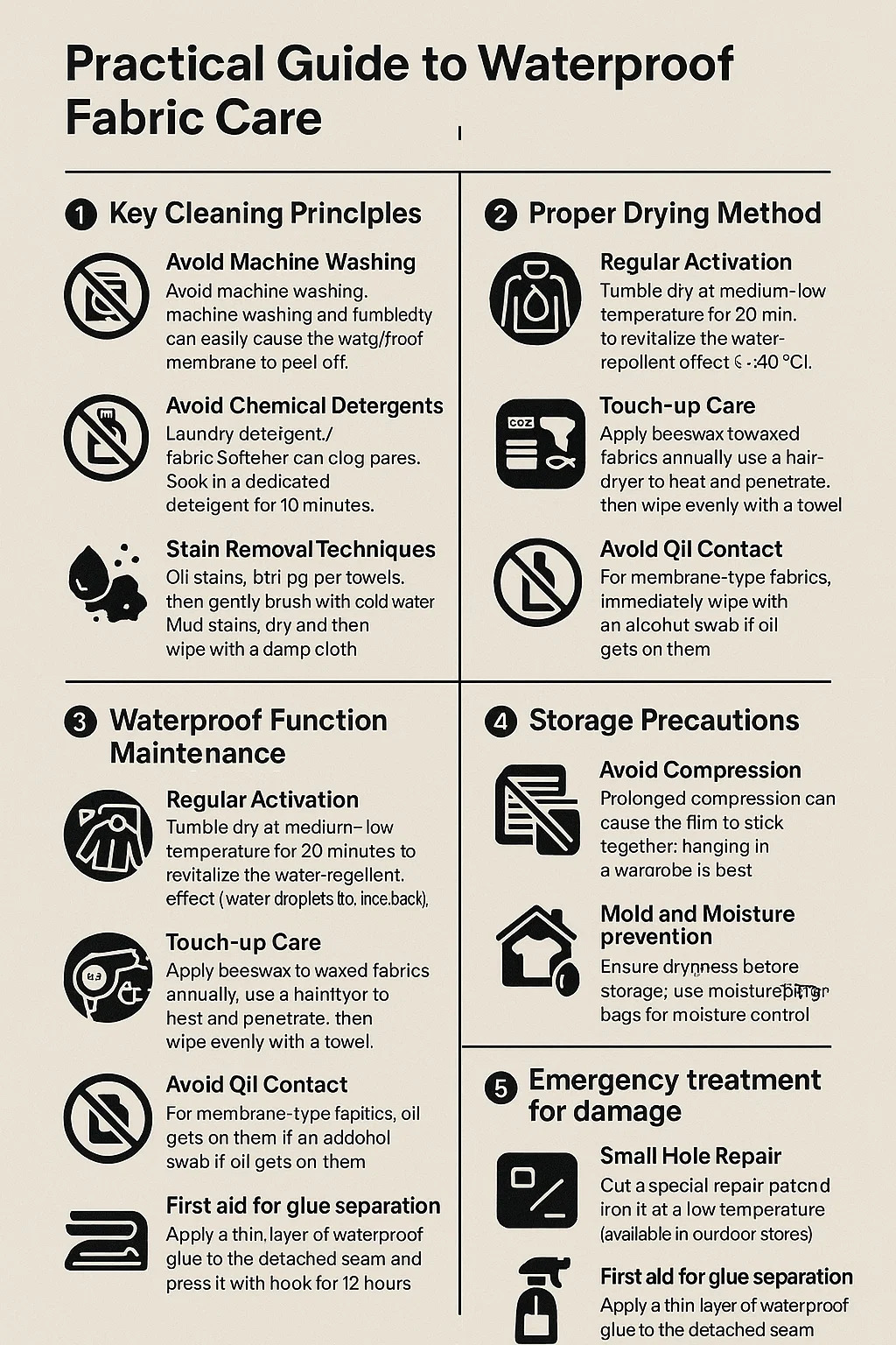 Kerülje a gépi mosást: A gépi mosás és a szárítógépben történő szárítás könnyen a vízálló membrán leválását okozhatja. A kézmosás és a gyengéd dörzsölés a legbiztonságosabb lehetőség.