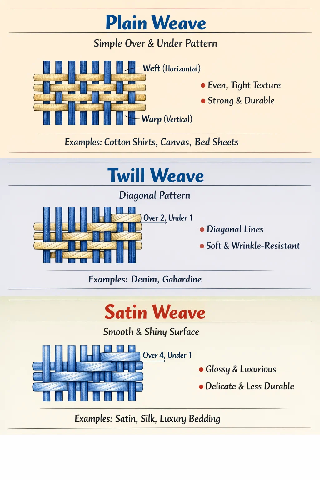 A textiliparban szinte minden szőtt szövetek három alapvető szövési technikából származnak. Ez a három szövési módszer határozza meg az anyag megjelenését, tartósságát és tapintását.