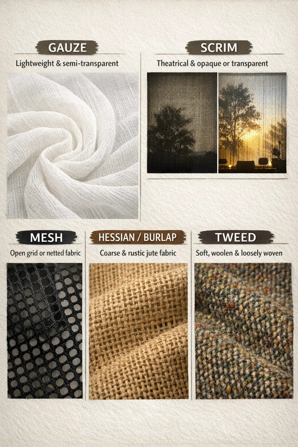 Amikor arról beszélünk szőtt szövetek "laza textúrájú és nagy hézagokkal" számos nagyon specifikus kifejezés írja le őket, használatuktól és megjelenésüktől függően.