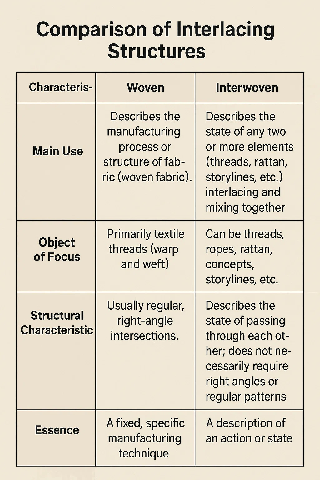 | Elsődleges felhasználás | Leírja a textíliák (szövött szövet) konkrét gyártási folyamatát vagy kész szerkezetét. | Leírja azt az állapotot, amikor bármely két vagy több elemkészlet (szálak, nádszálak, történetszálak stb.) keresztbe vagy keverve van. |
