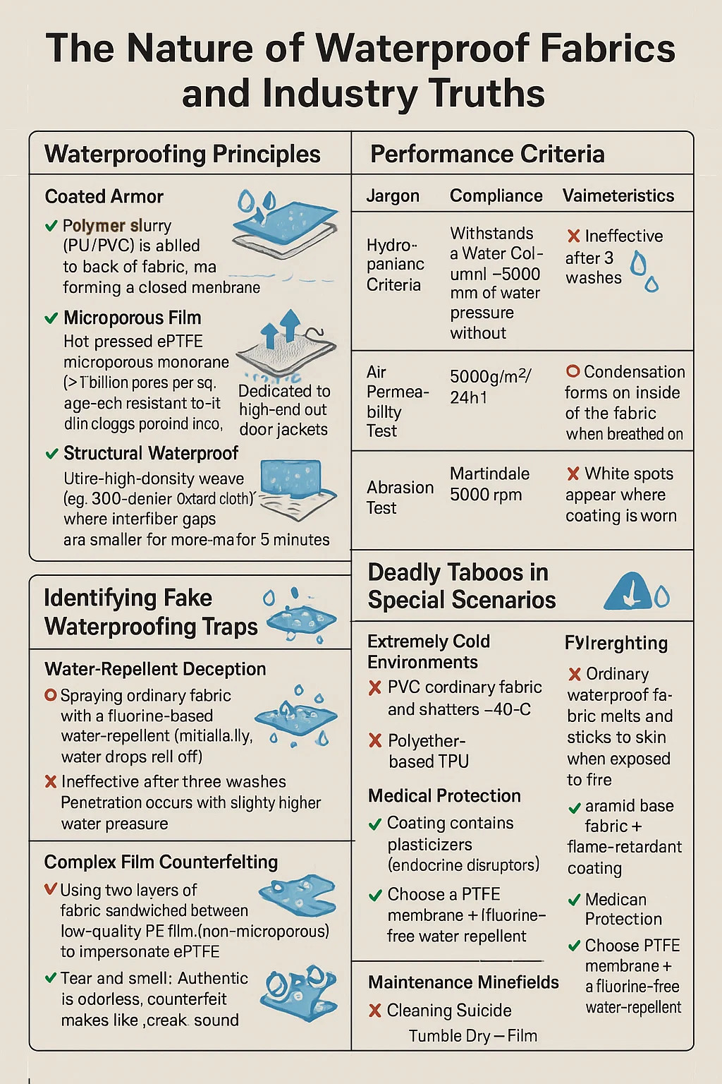 Szerkezeti vízálló: Ultra-nagy sűrűségű szövés (pl. 300 denier Oxford szövet), ahol a szálak közötti hézagok kisebbek, mint a vízmolekulák nyomása. ** Tartós ** 5 percnél tovább nem bírja az esőt.