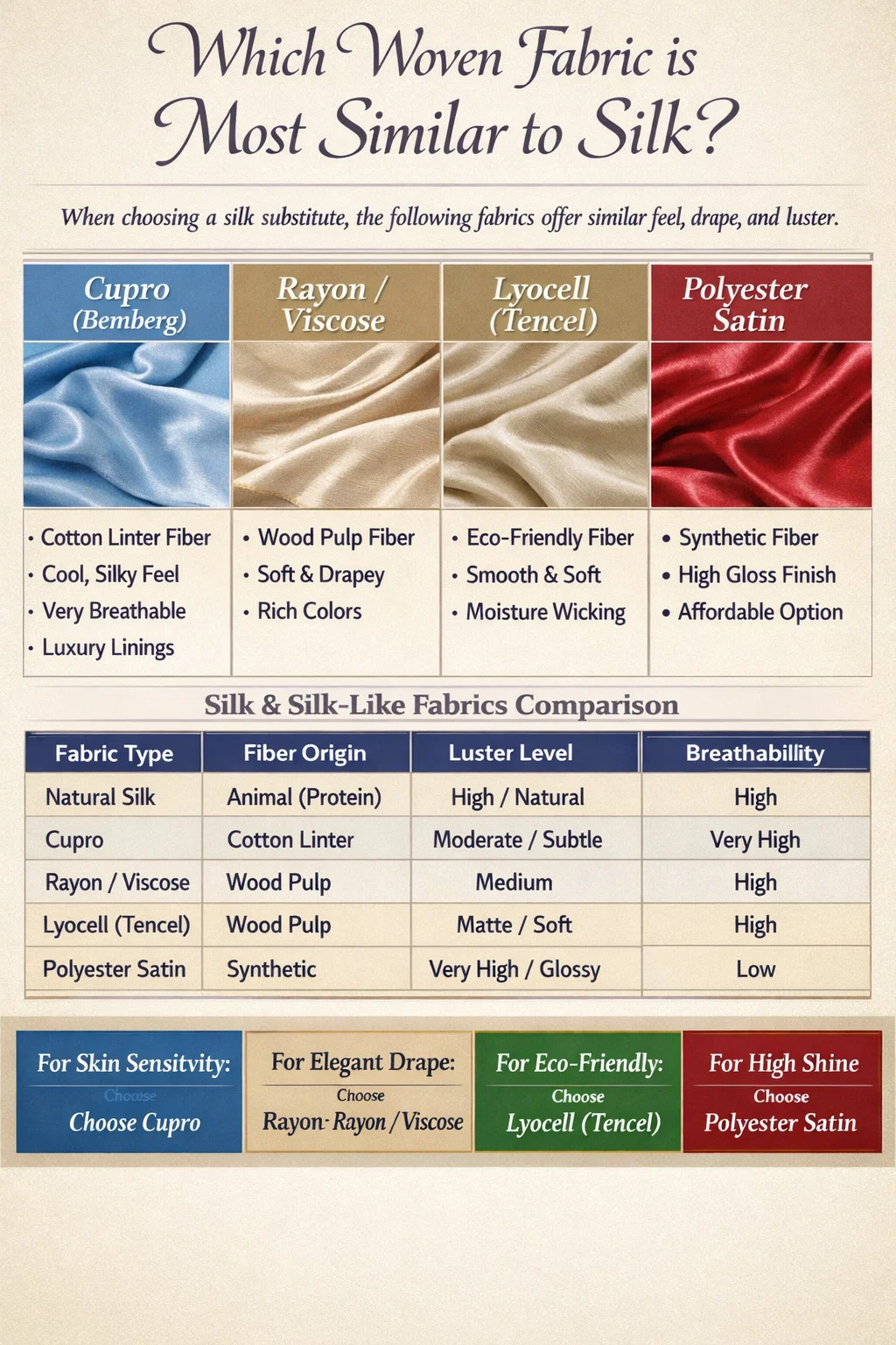 Amikor keres a szövött szövet amely megismétli a természetes selyem fényűző érzetét, fényét és burkolatát, a legkiemelkedőbb versenyzők Rayon, Cupro és Lyocell (Tencel) . Ezek között A Cupro-t széles körben a legközelebbi mérkőzésnek tartják légáteresztő képesség és selymes tapintás tekintetében, míg Szatén szövésű poliészter a legelterjedtebb megfizethető szintetikus alternatíva. Ezek a szövetek speciális szövés technikák a selyemhernyók által termelt sima fehérjeszálak utánzására.